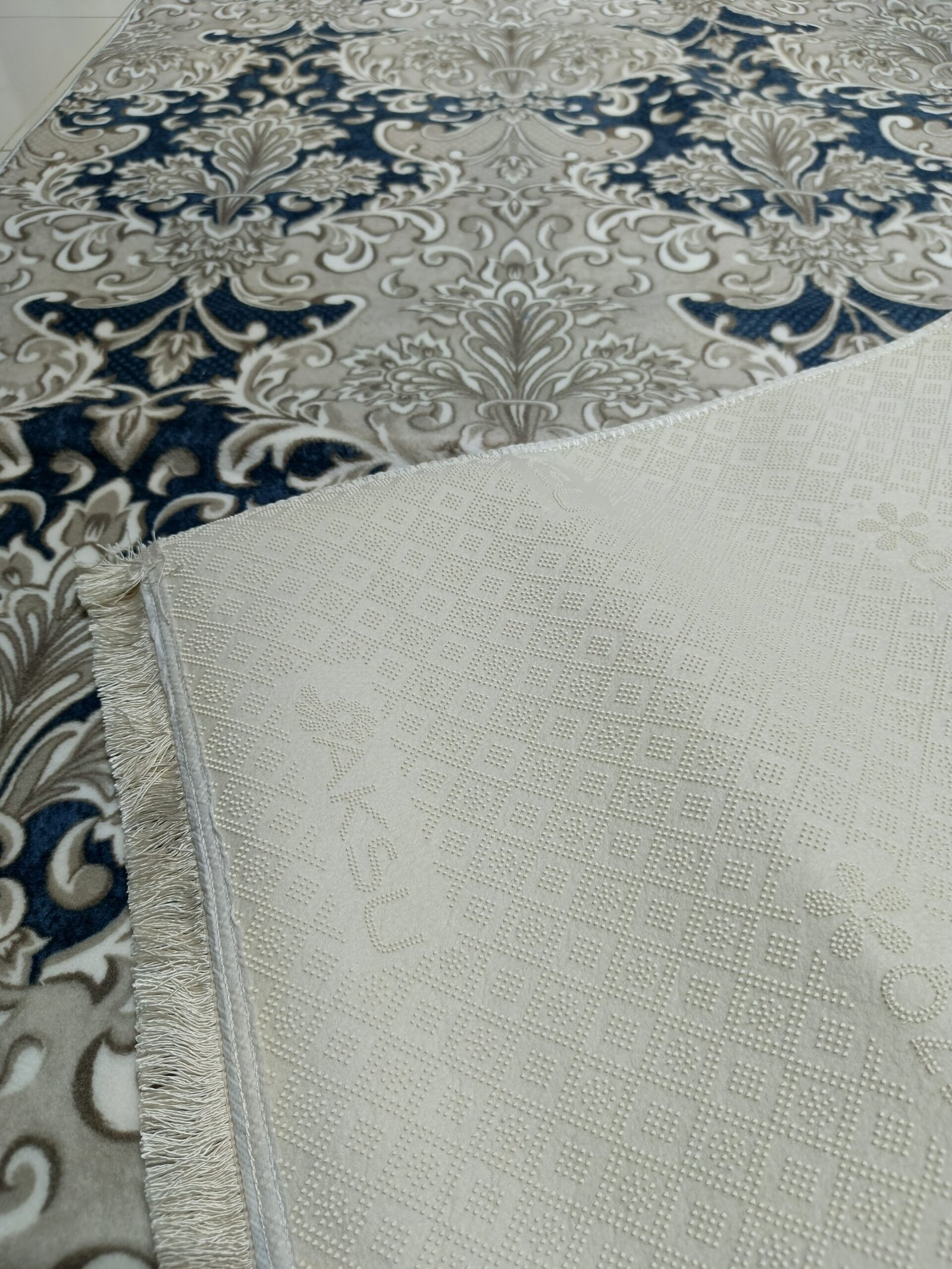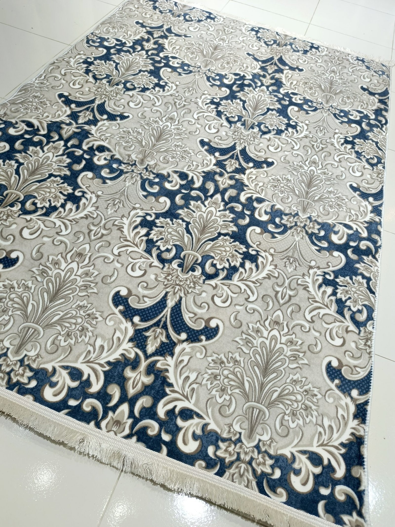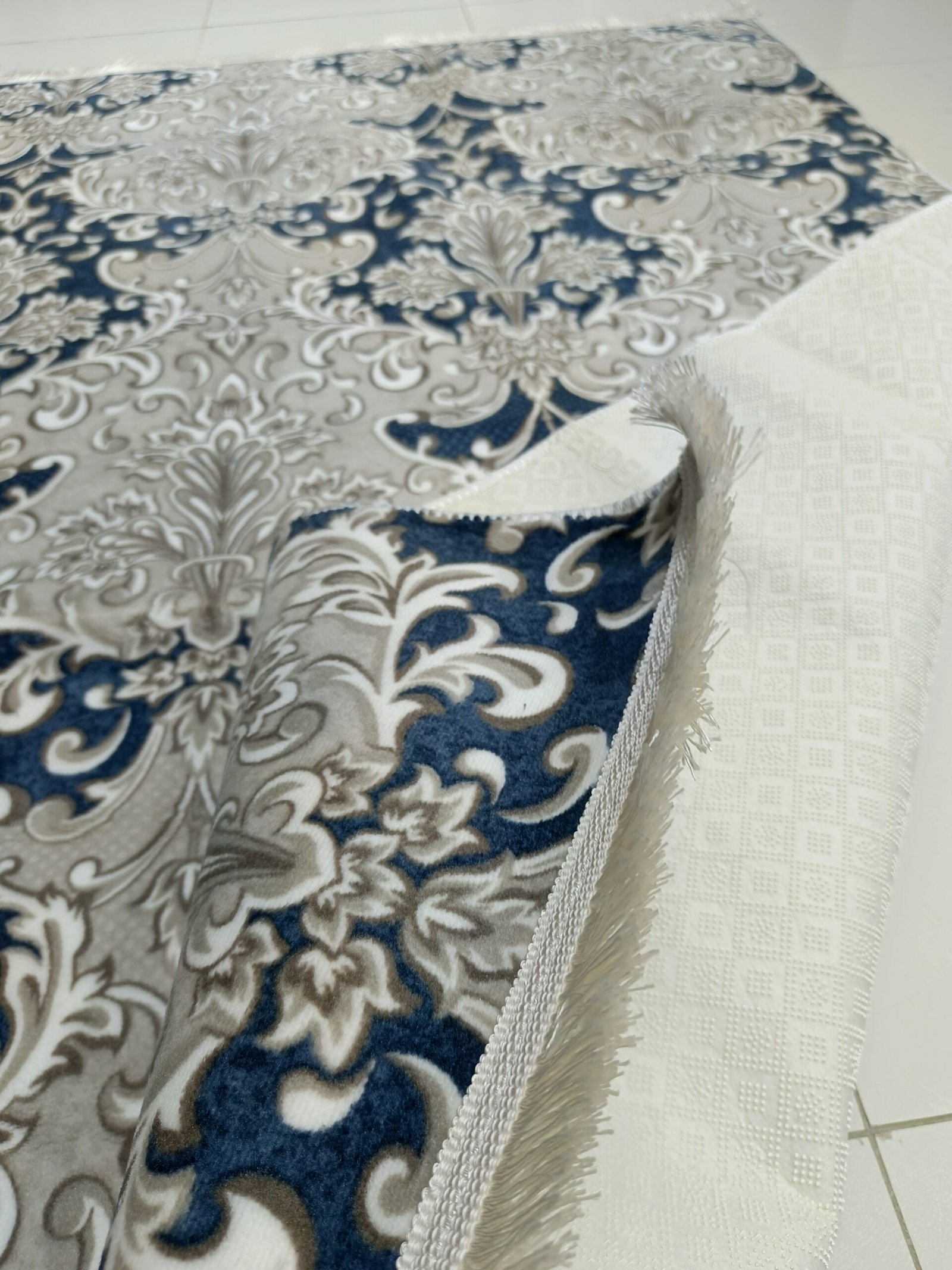 Add a royal touch to your home with the Royal Azure Rug โ a premium Turkish lightweight carpet designed with intricate floral baroque patterns in beige and deep navy blue.