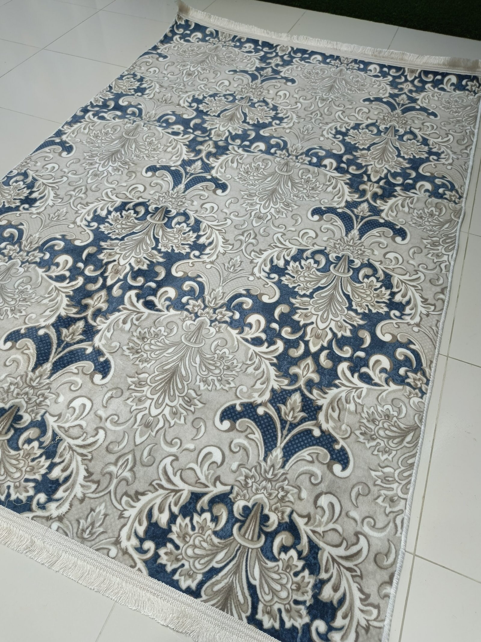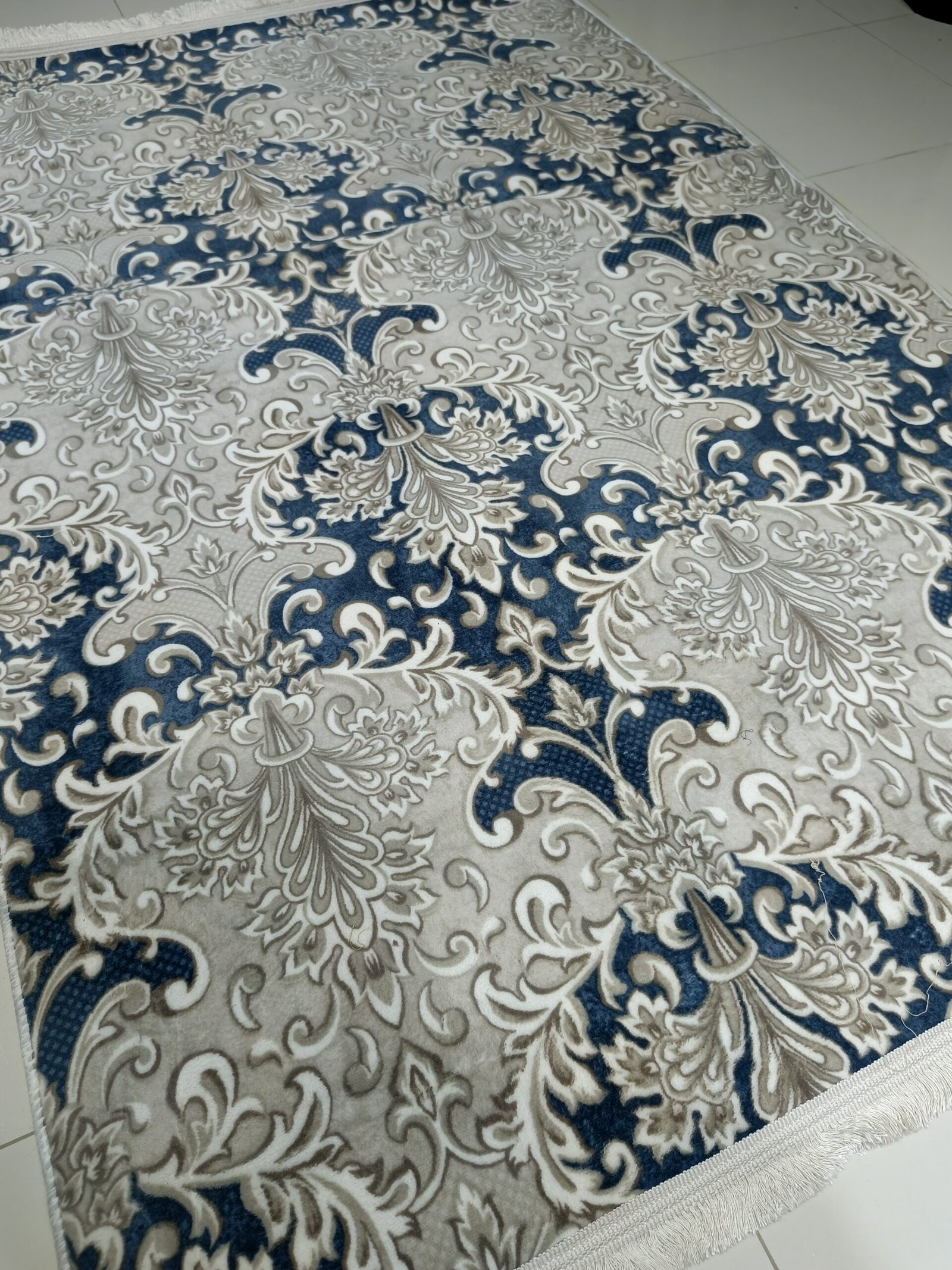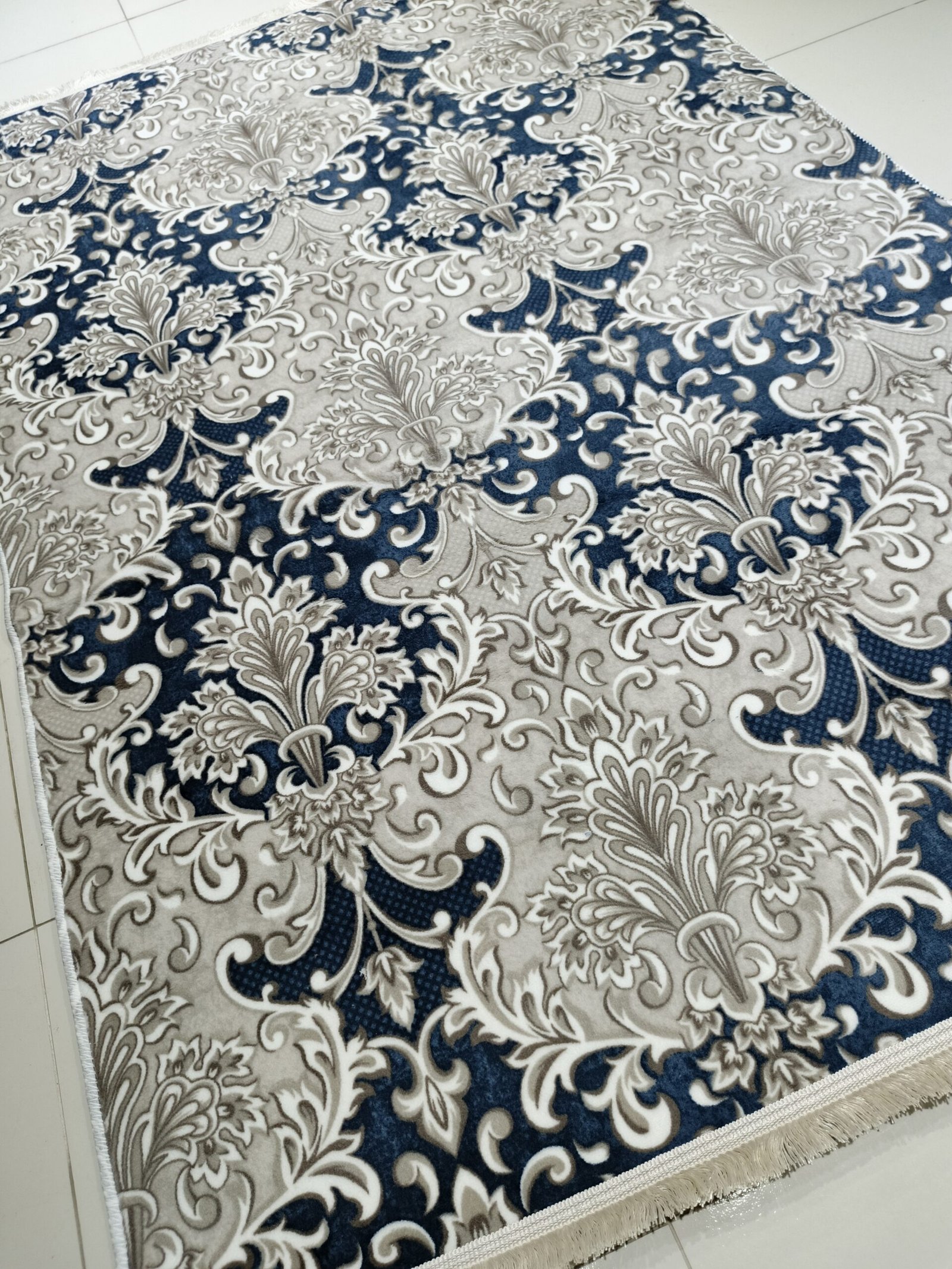 Add a royal touch to your home with the Royal Azure Rug โ a premium Turkish lightweight carpet designed with intricate floral baroque patterns in beige and deep navy blue.