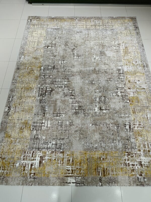 This rug blends muted beige, soft greys, and rich gold accents in an abstract textured pattern — perfect for anyone who loves a modern, classy, minimal yet luxurious look.