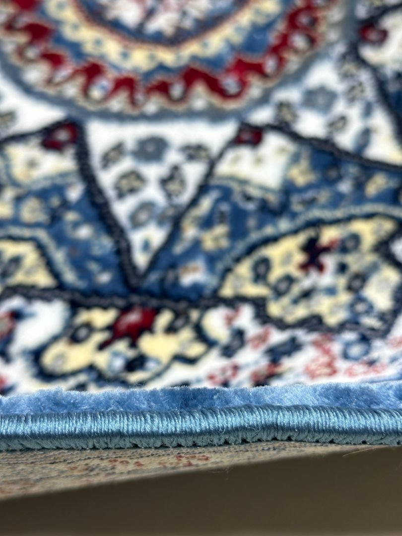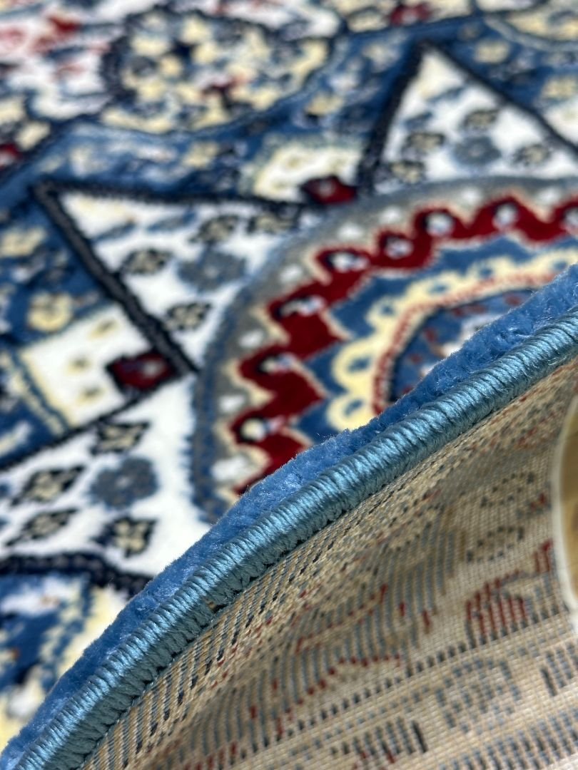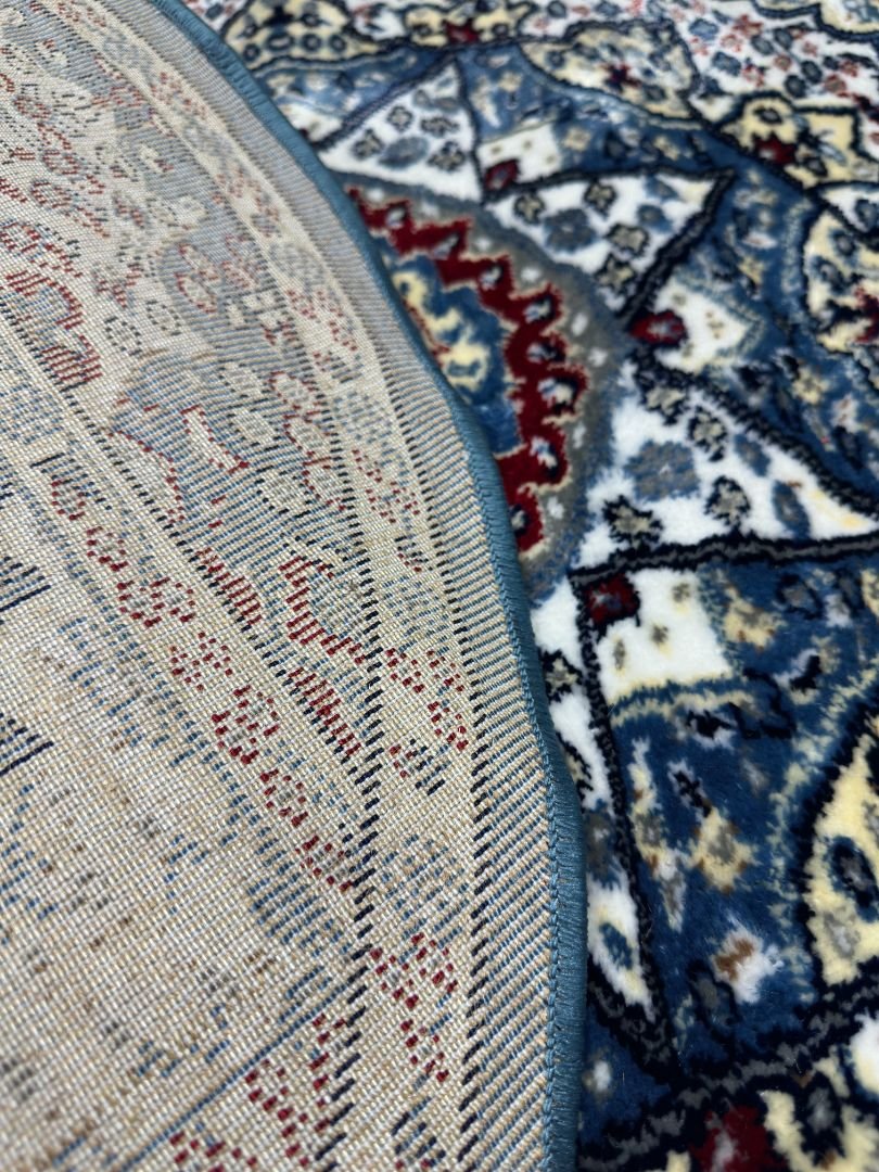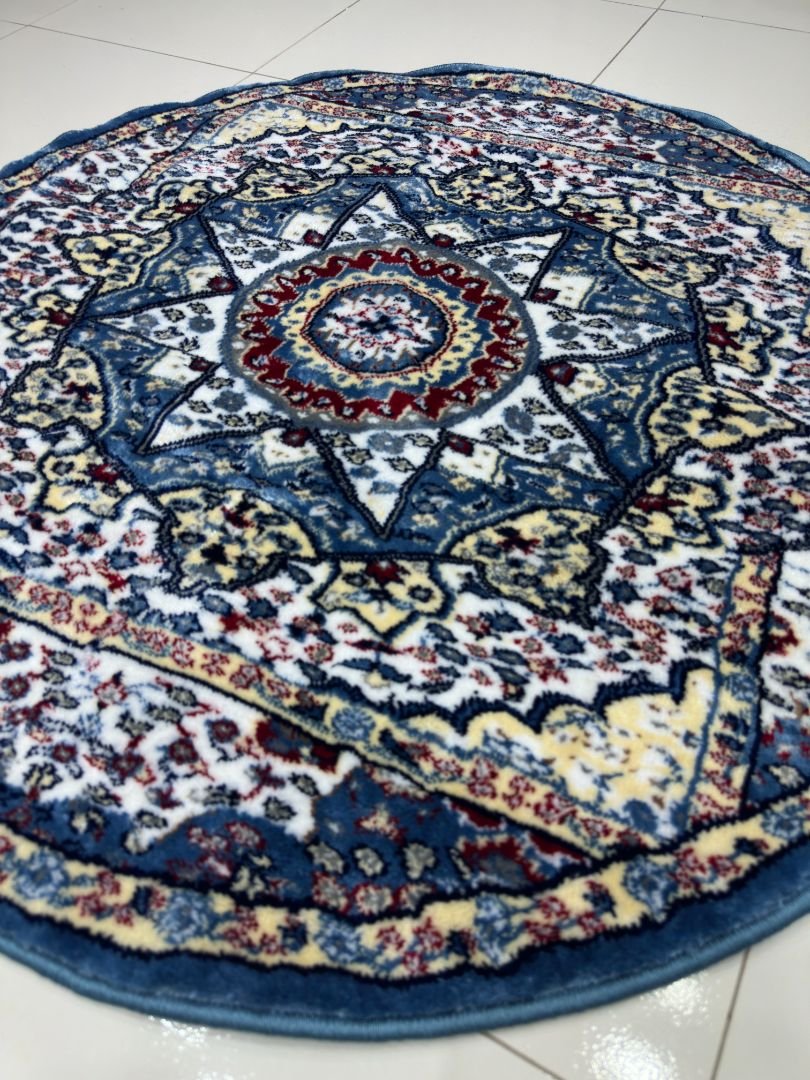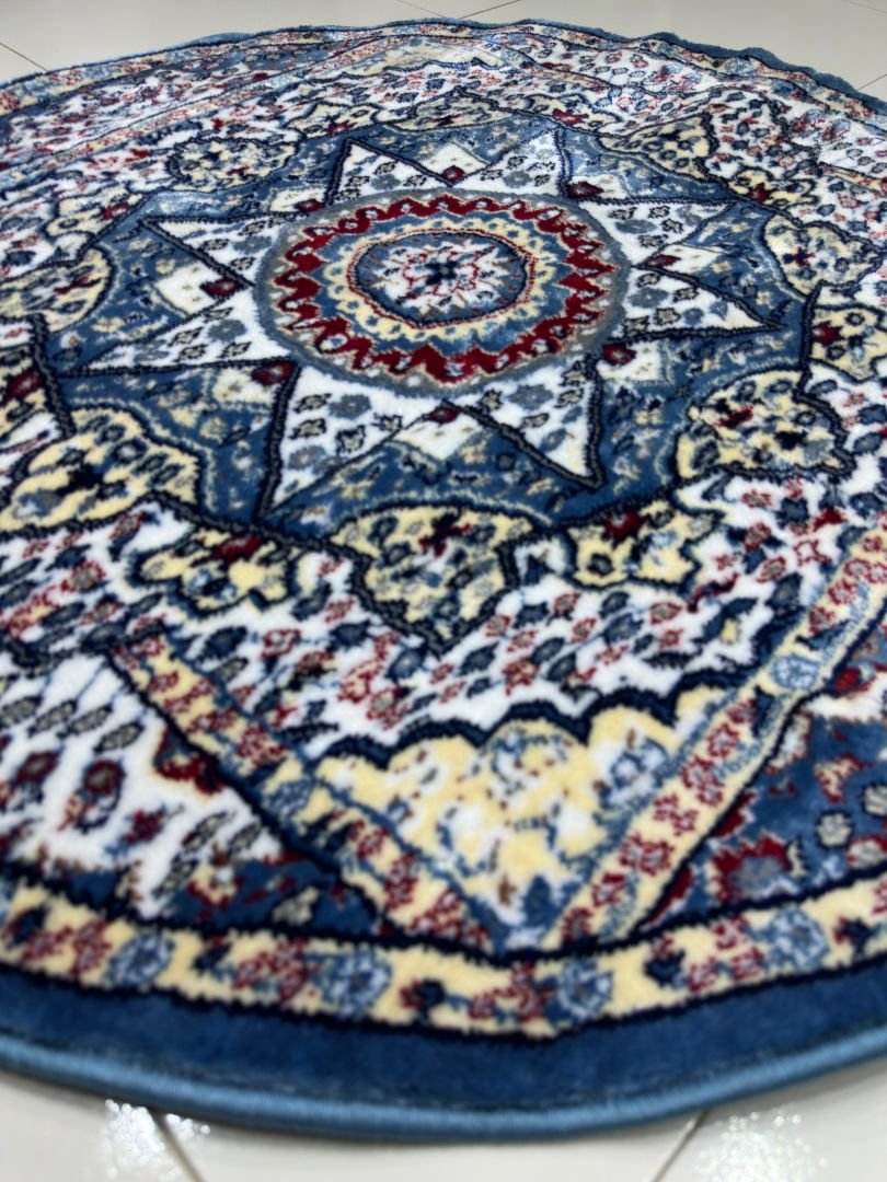 A vibrant round rug featuring a bold central medallion with intricate patterns in blue, ivory, and subtle red accents.