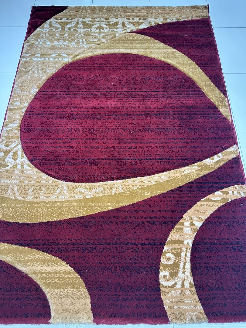 The Crimson Halo rug features sweeping circular forms in deep red, soft gold, and subtle beige accents, creating a sense of flow and visual balance. The bold abstract composition makes it an eye-catching statement piece while still maintaining harmony within the space.