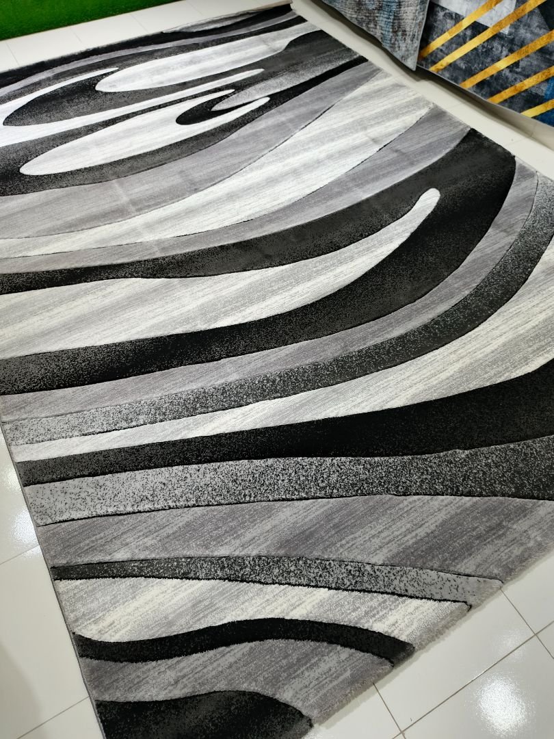 Ashen Flow features layered wave patterns in charcoal, grey, and soft ivory tones. The design feels fluid, calm, and modern, making it easy to style in contemporary interiors. This heavyweight Turkish rug is listed under our Bargain Bin due to visible stains on the back side only. Front appearance, softness, and usability remain fully intact.
