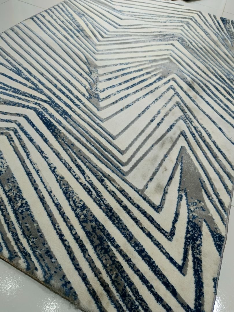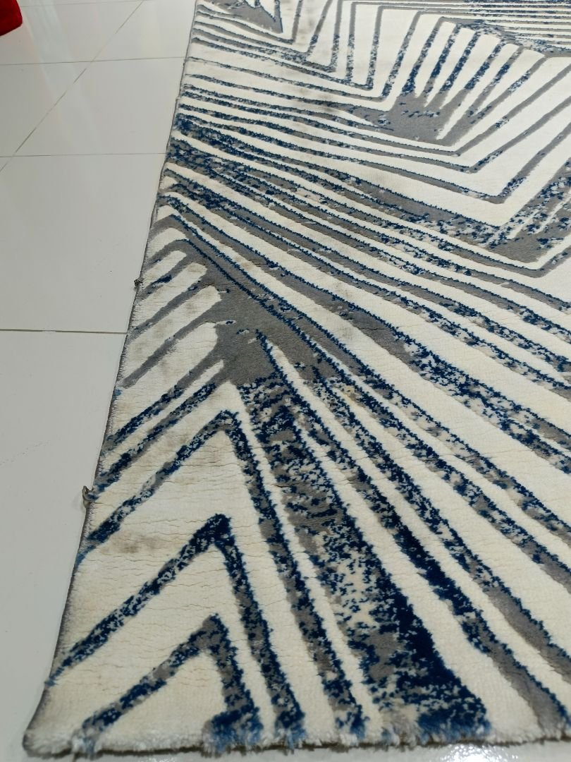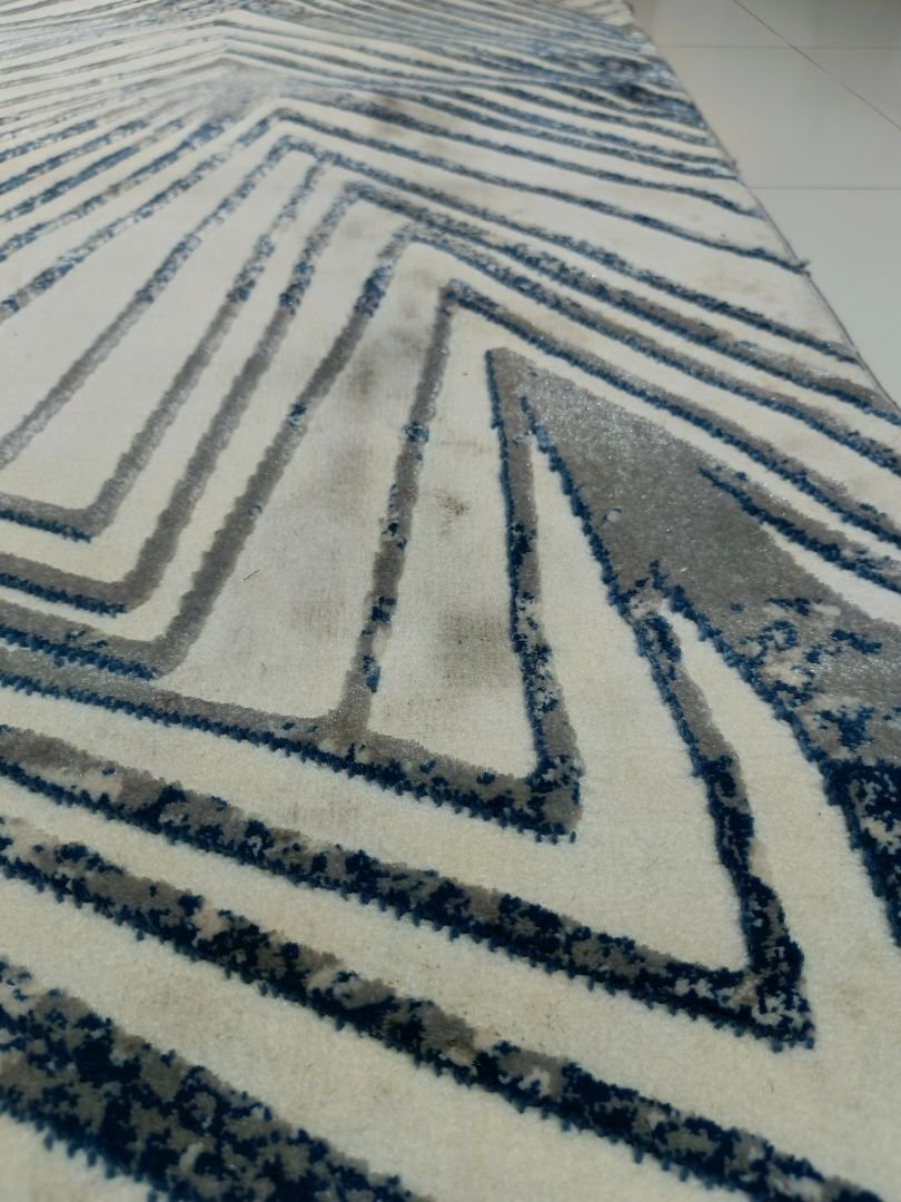 Azure Trace features a bold geometric pattern with layered zig-zag lines in beige, grey, and muted blue tones, finished with a subtle 3D shine. The design is modern and structured, ideal for contemporary spaces. This rug is listed under our Bargain Bin due to visible stains on both the front and back sides.