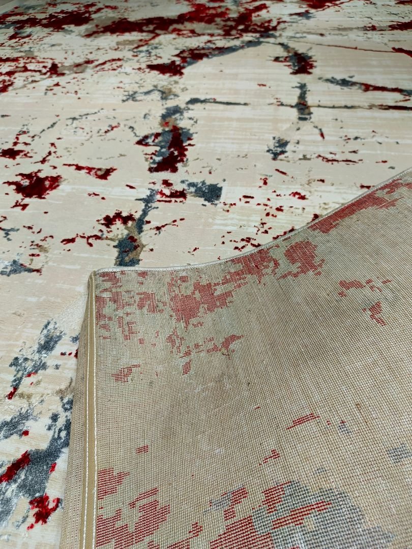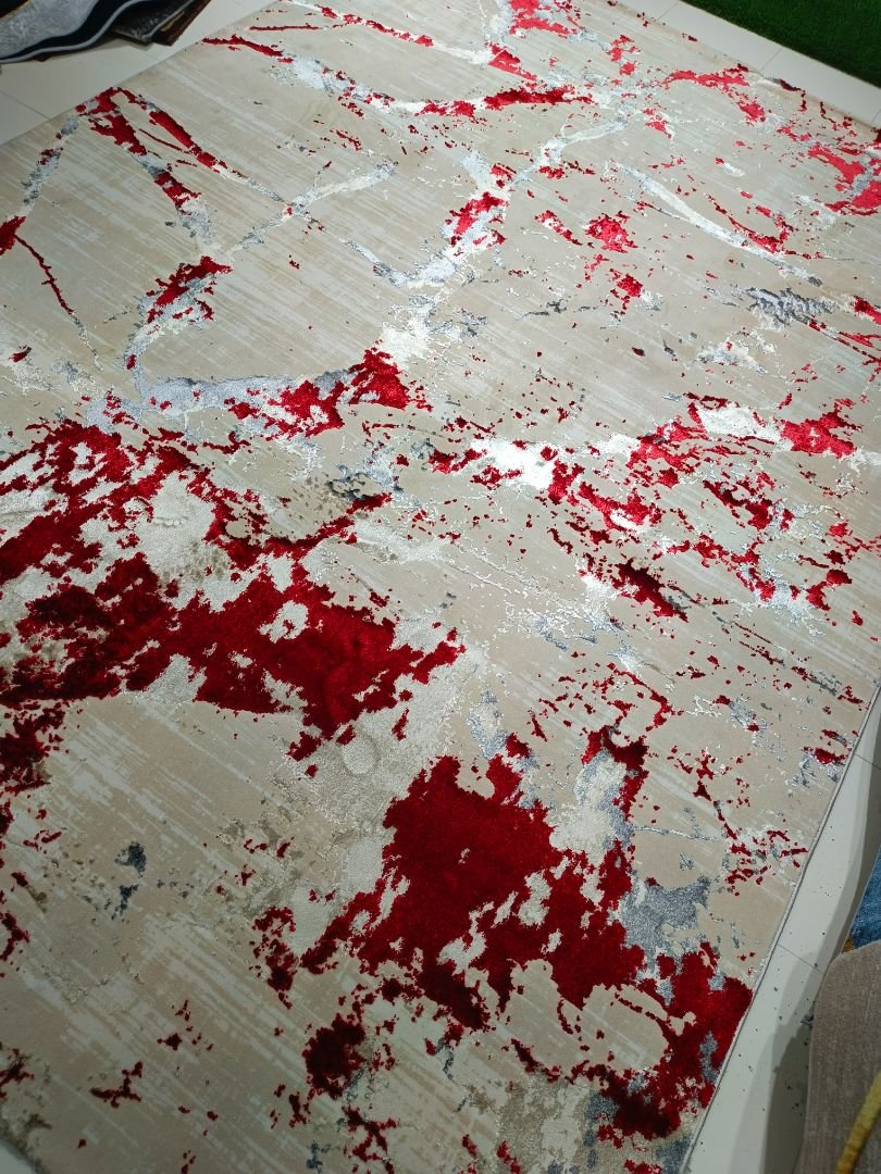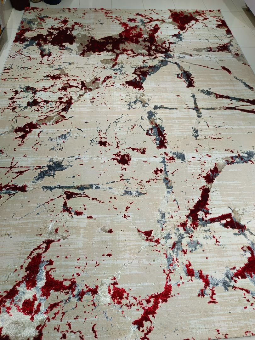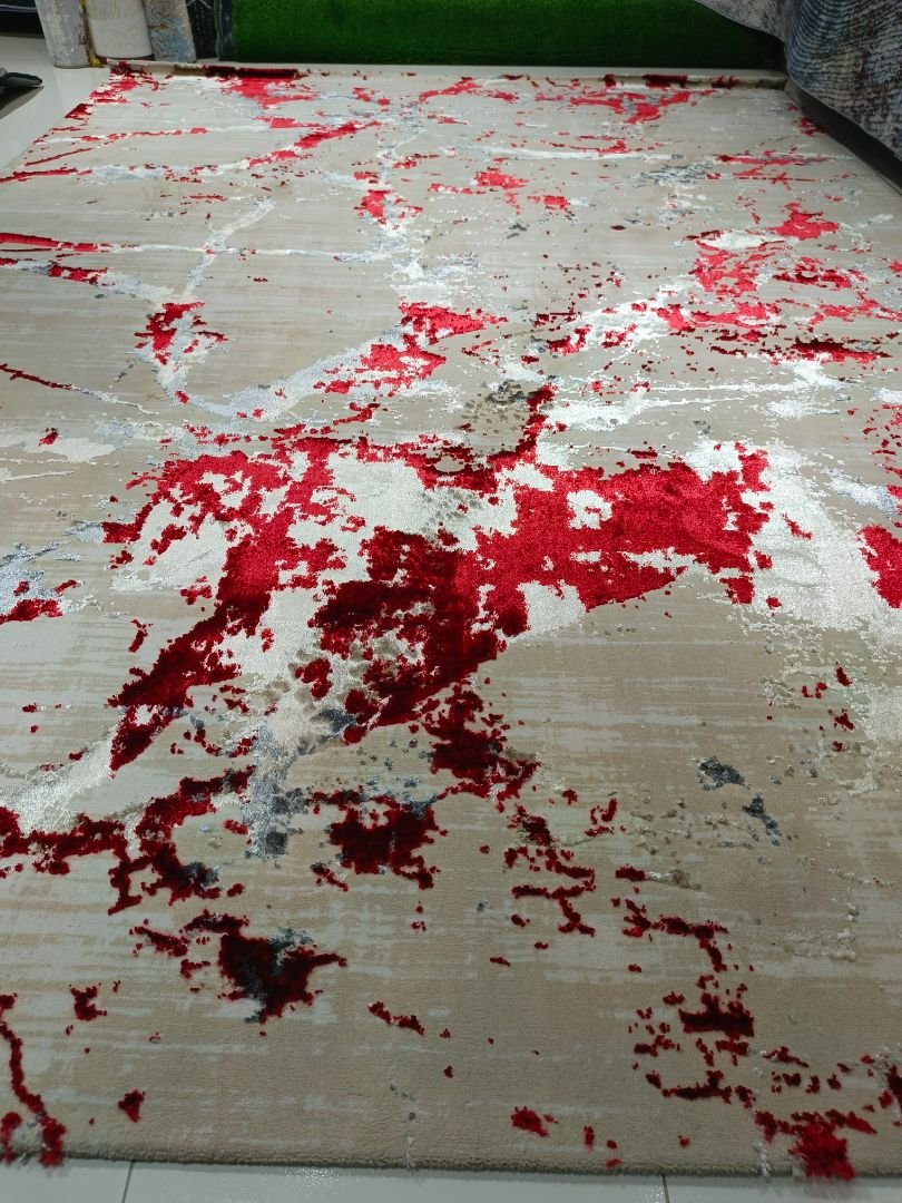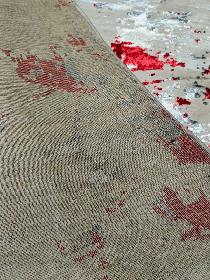 Crimson Rift features a bold abstract fusion of deep red, soft beige, and metallic silver tones. Thick, heavy, and visually striking, this oversized rug is placed in our Bargain Bin due to stains on the back side only. Front design and comfort remain fully intact.