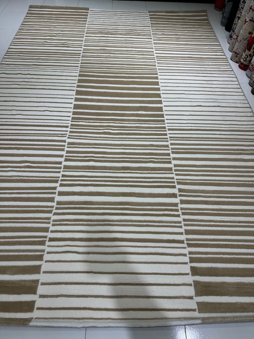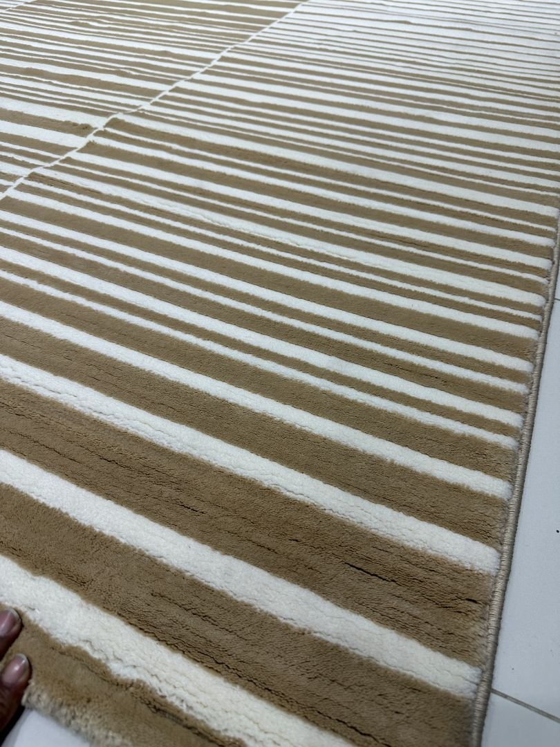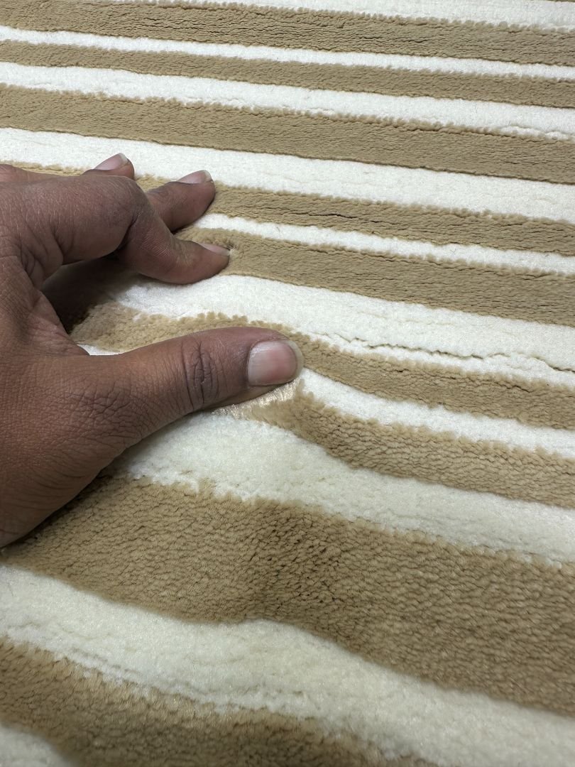 The design features soft horizontal stripes arranged in structured panels, blending warm beige and ivory tones to create a balanced, minimal aesthetic.