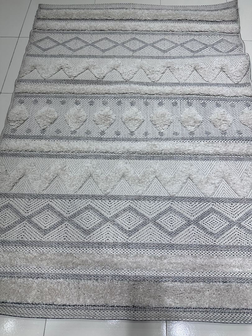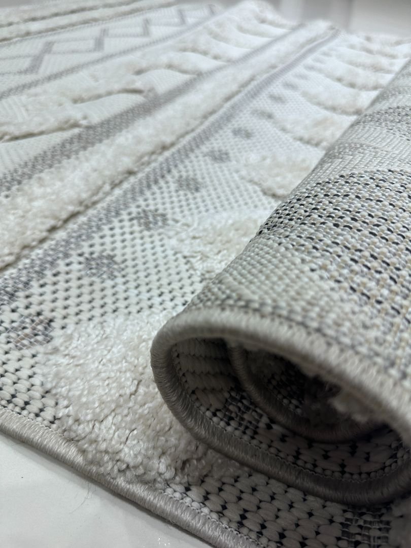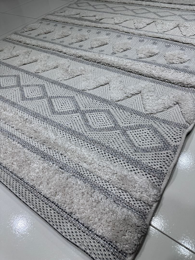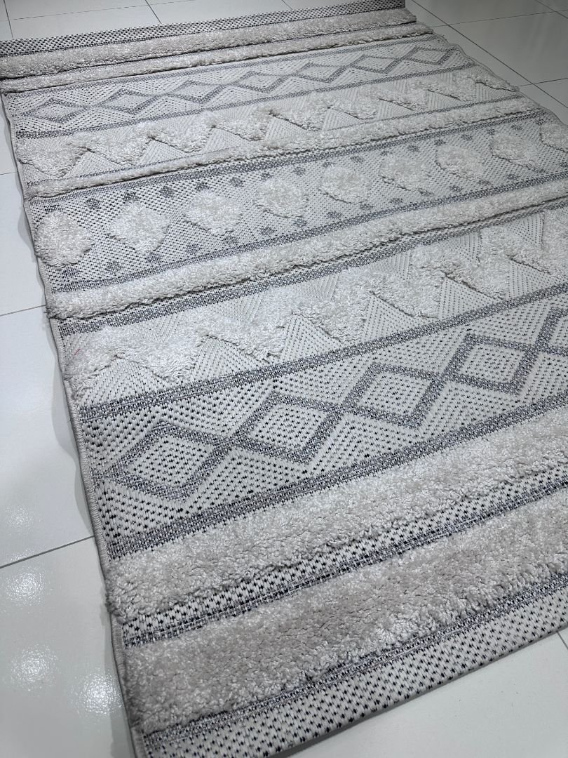 Crafted in Turkey with a soft plush texture, this carpet blends woven geometric motifs with raised patterns that add depth and character to modern interiors. Its subtle neutral color makes it easy to match with minimalist, Scandinavian, or contemporary home décor.