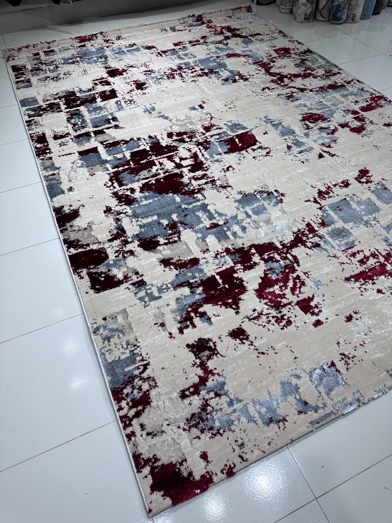 A contemporary abstract design with subtle shine, blending soft beige with bold red and grey accents.