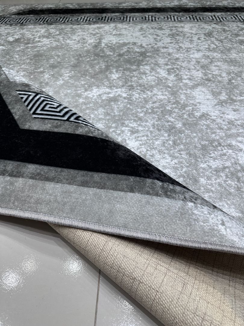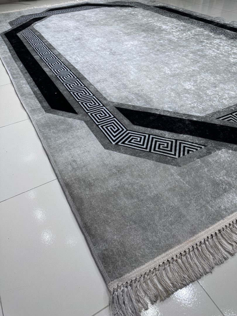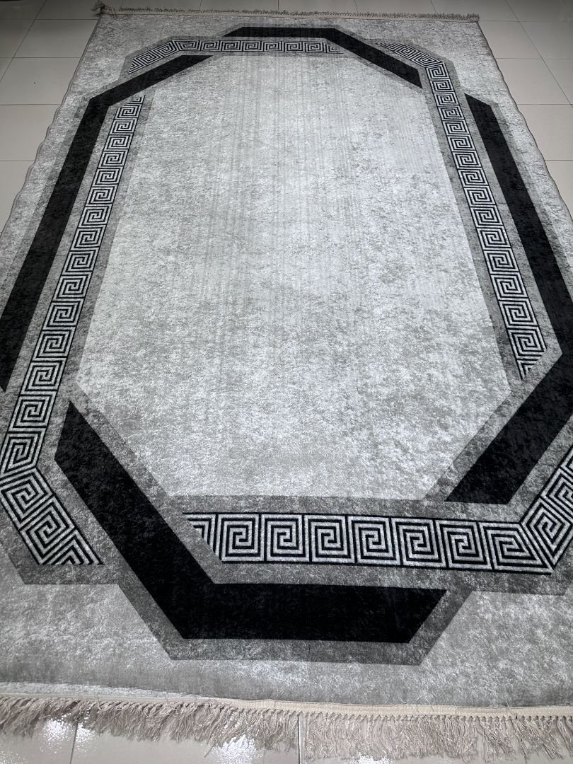 A perfect blend of minimal design and bold geometry, this Turkish carpet brings a clean, architectural look to your space. The subtle grey base paired with the striking black Greek key border pattern creates a refined, modern aesthetic that instantly upgrades any room.