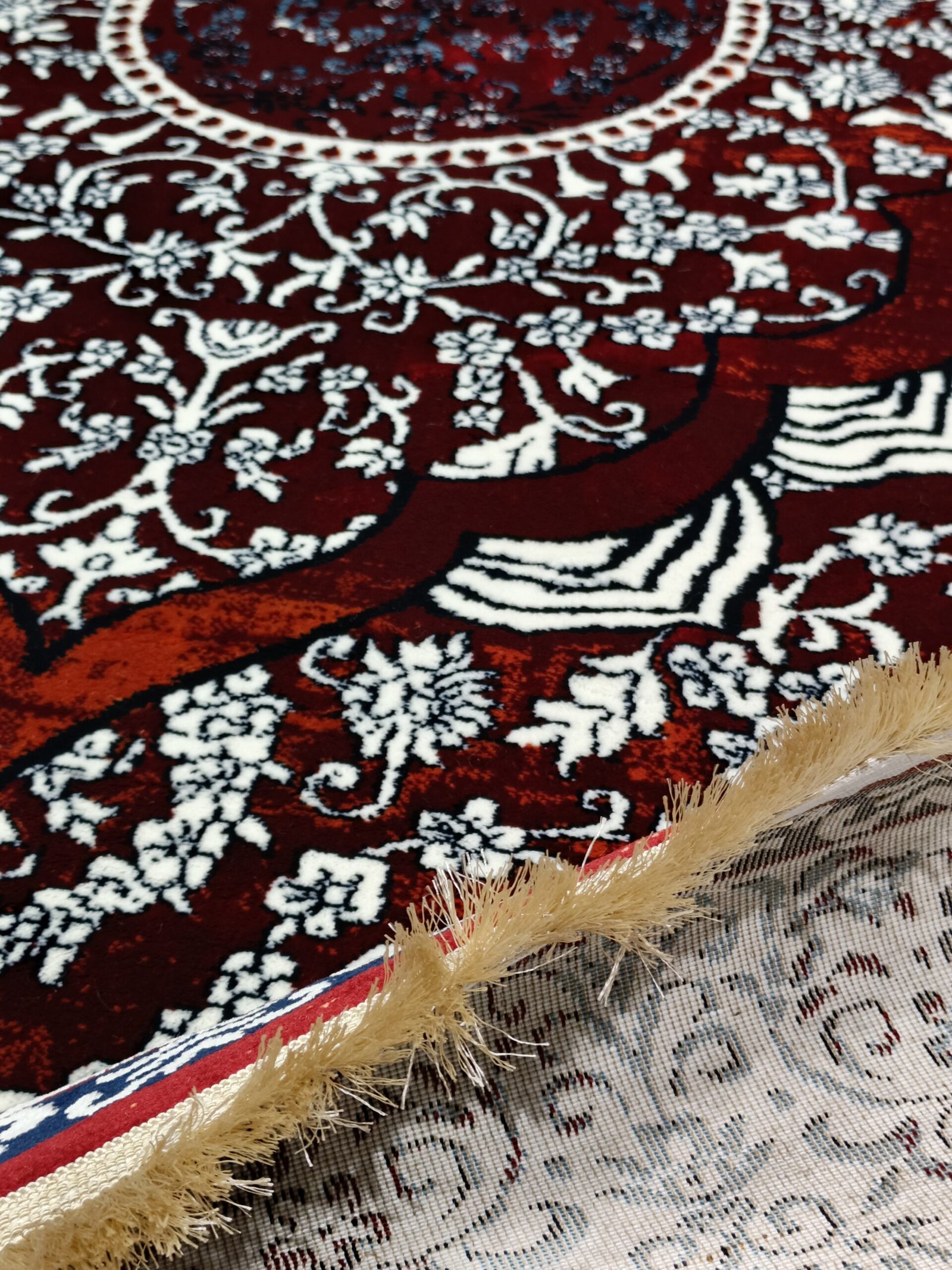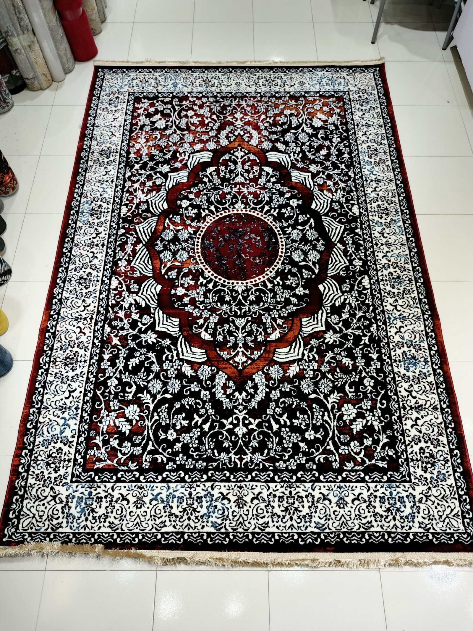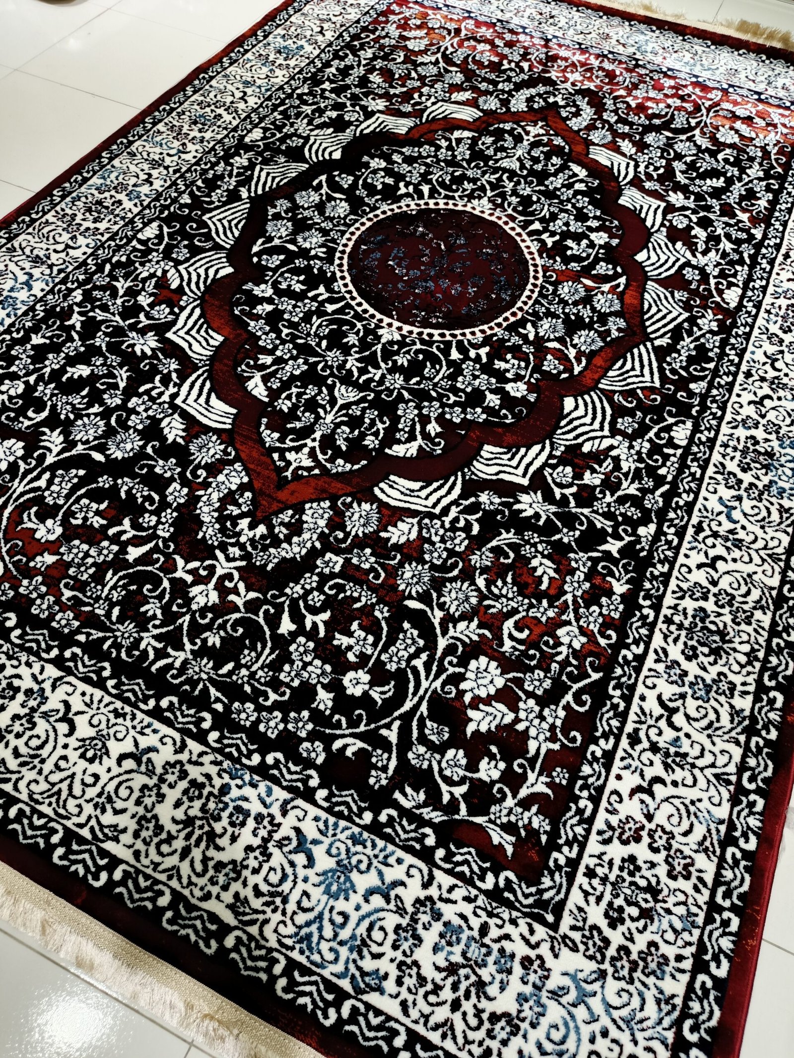 This carpet features a deep black base enriched with fiery red tones, a grand circular medallion, and intricate floral detailing—perfect for those who love bold, regal home décor.