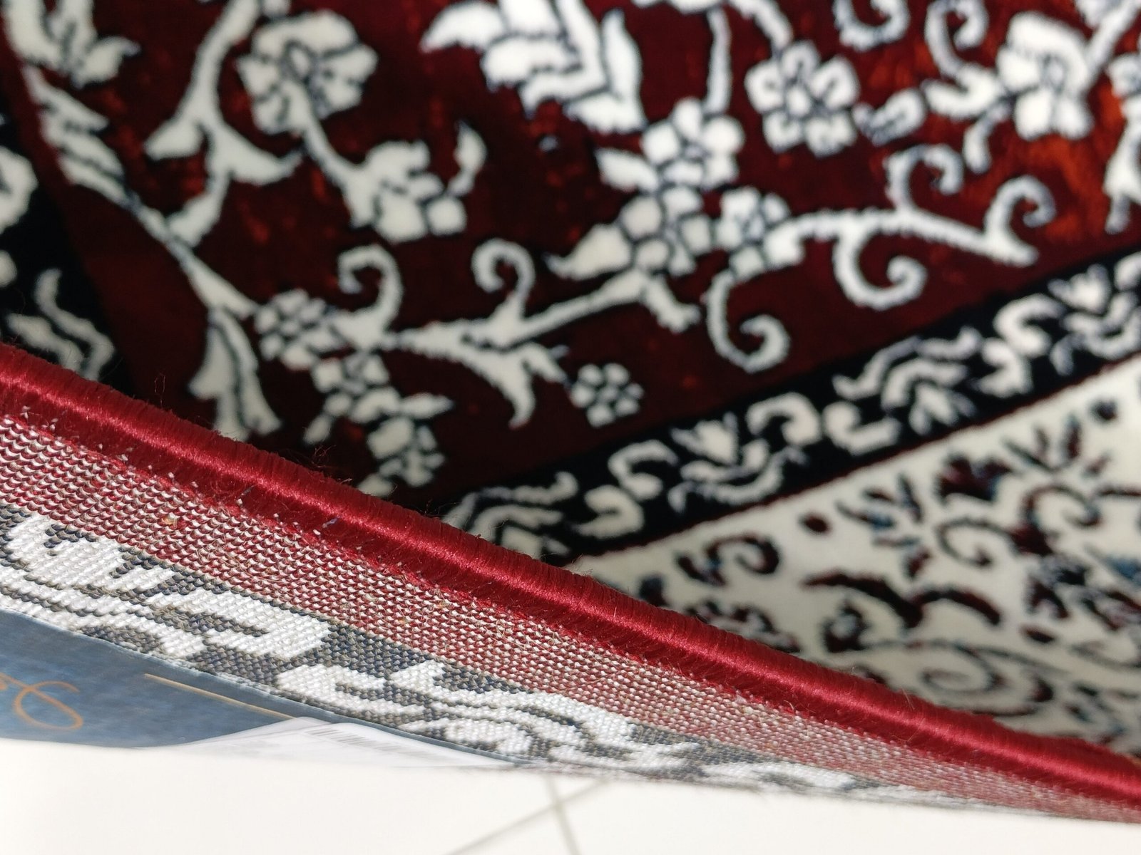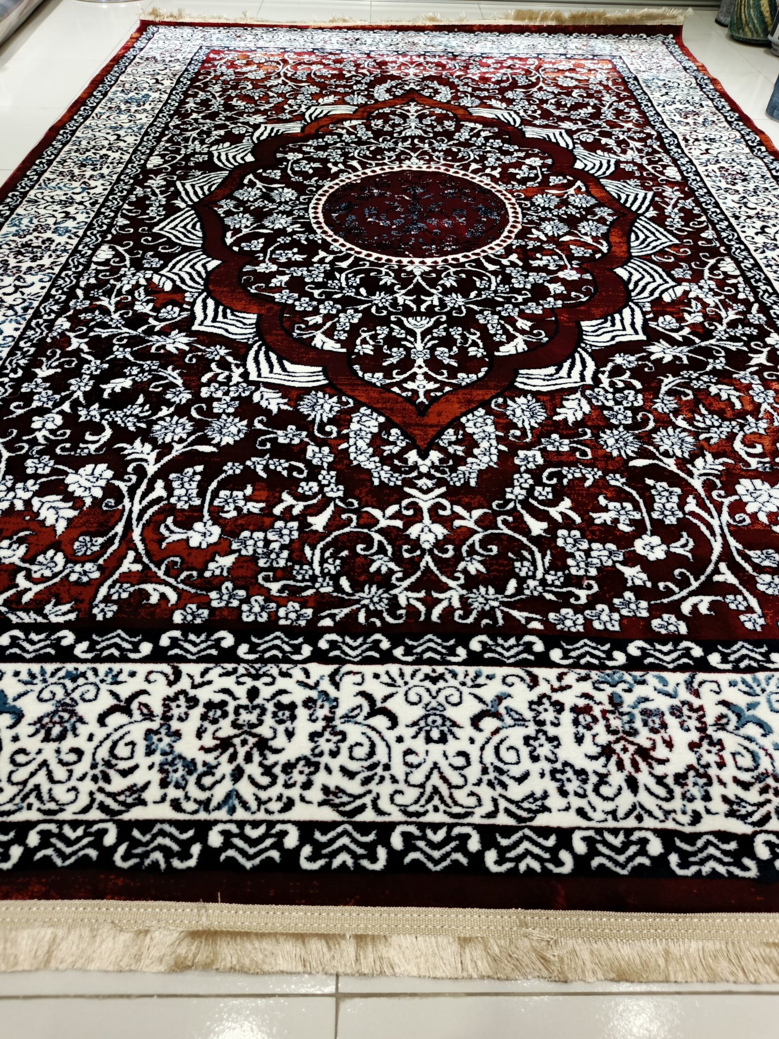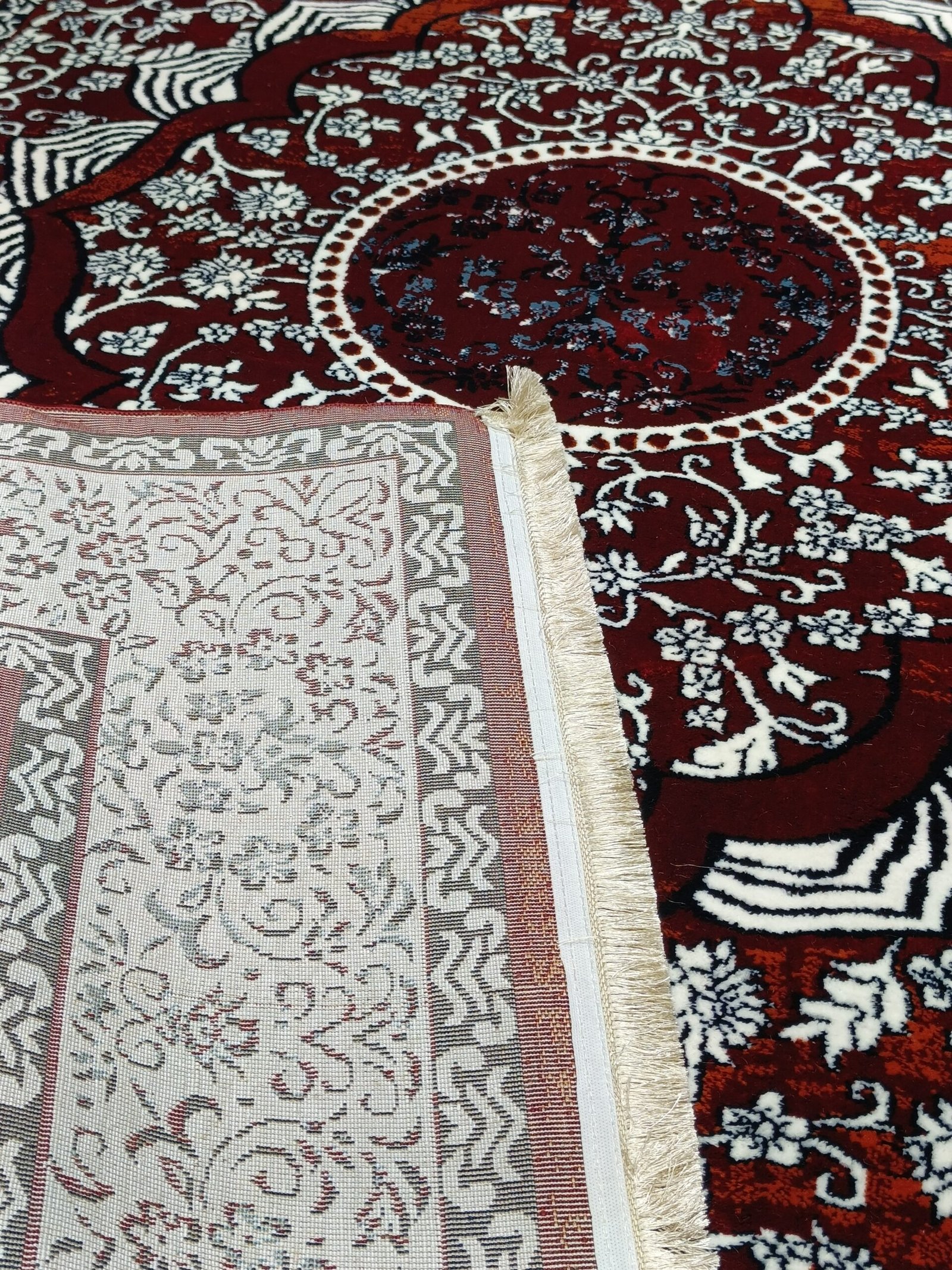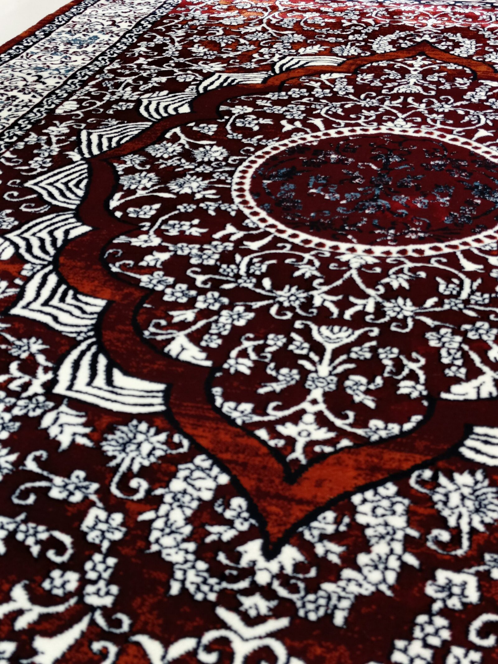 This carpet features a deep black base enriched with fiery red tones, a grand circular medallion, and intricate floral detailing—perfect for those who love bold, regal home décor.