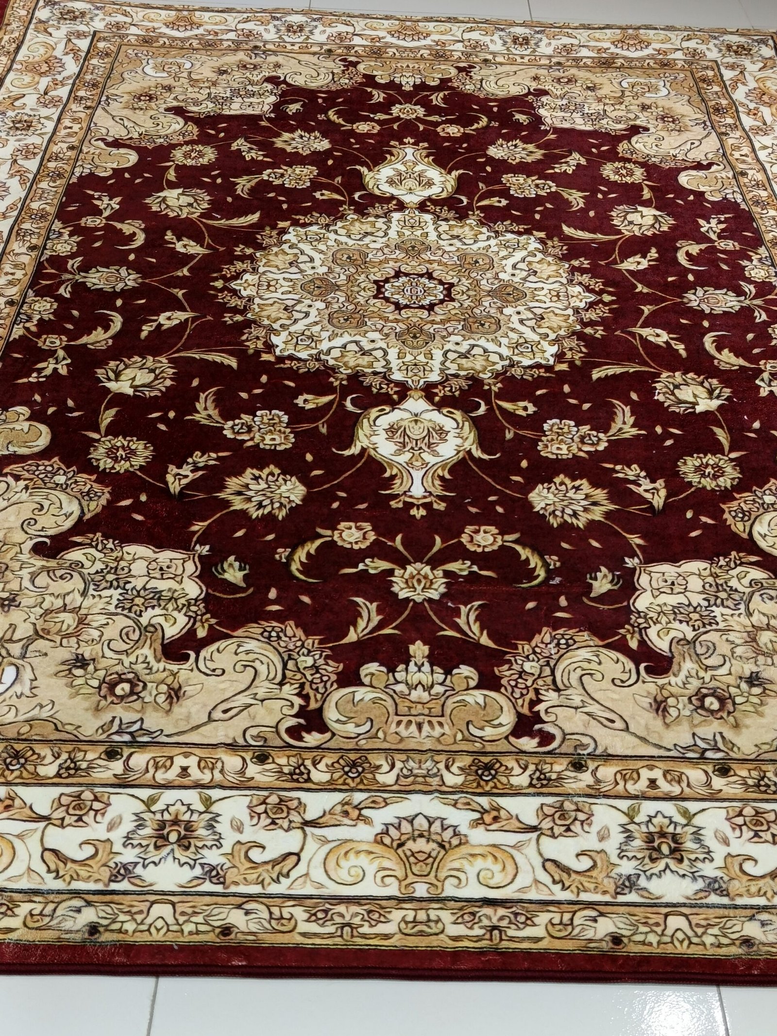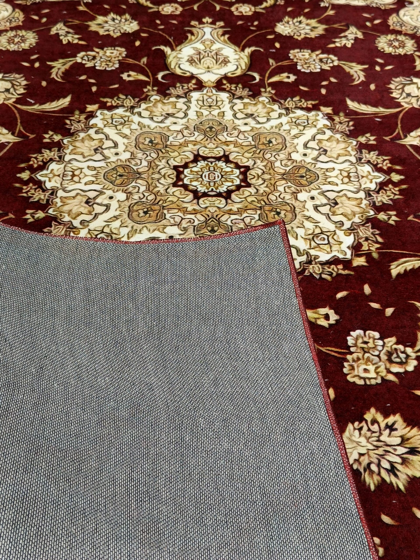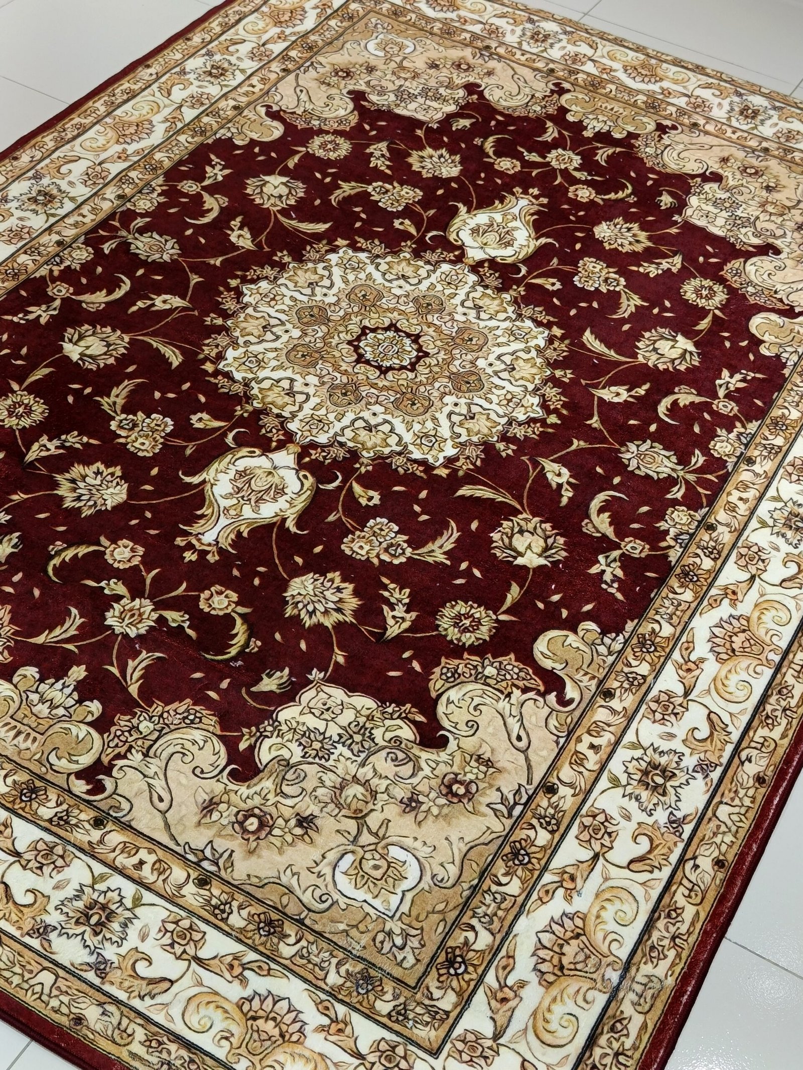 Crafted from premium soft velvet (8mm thickness), it features a deep maroon center medallion, surrounded by traditional Persian floral motifs and an ornate border in beige, cream, and gold tones.