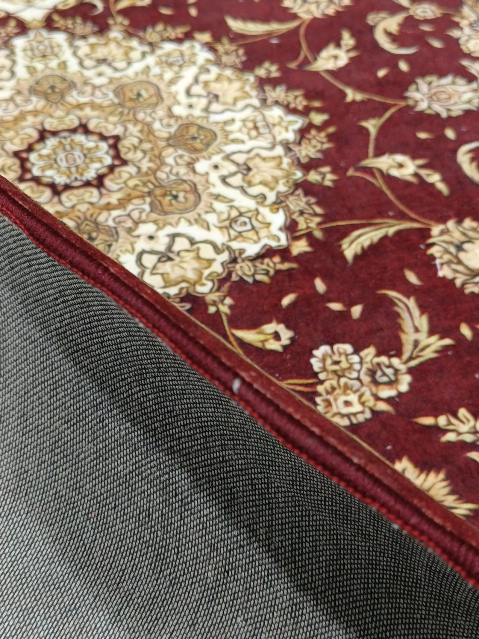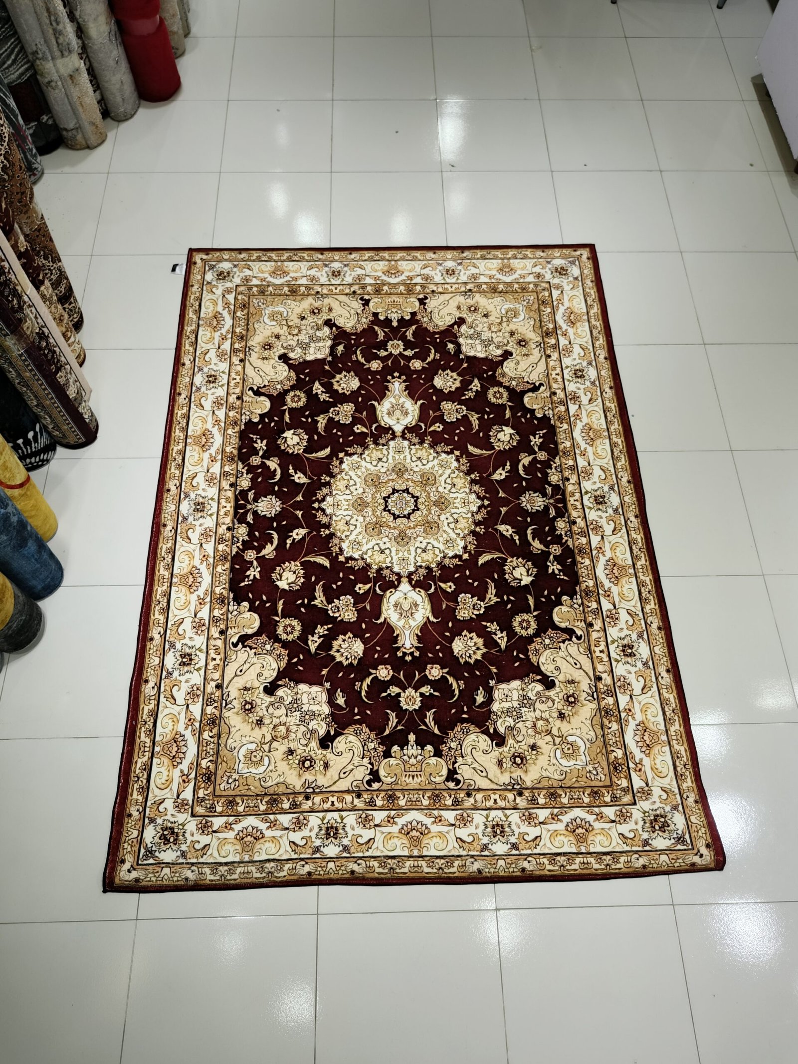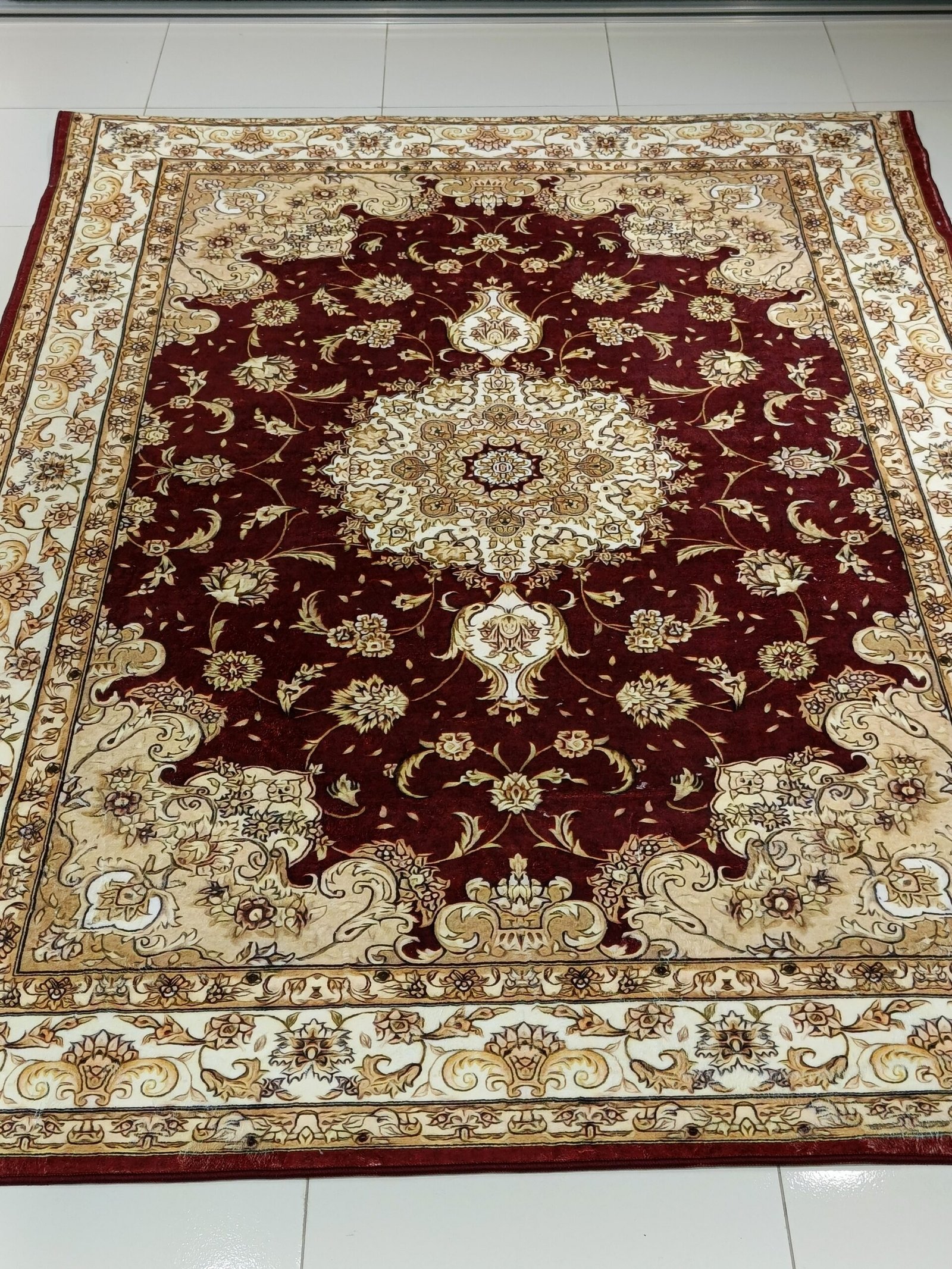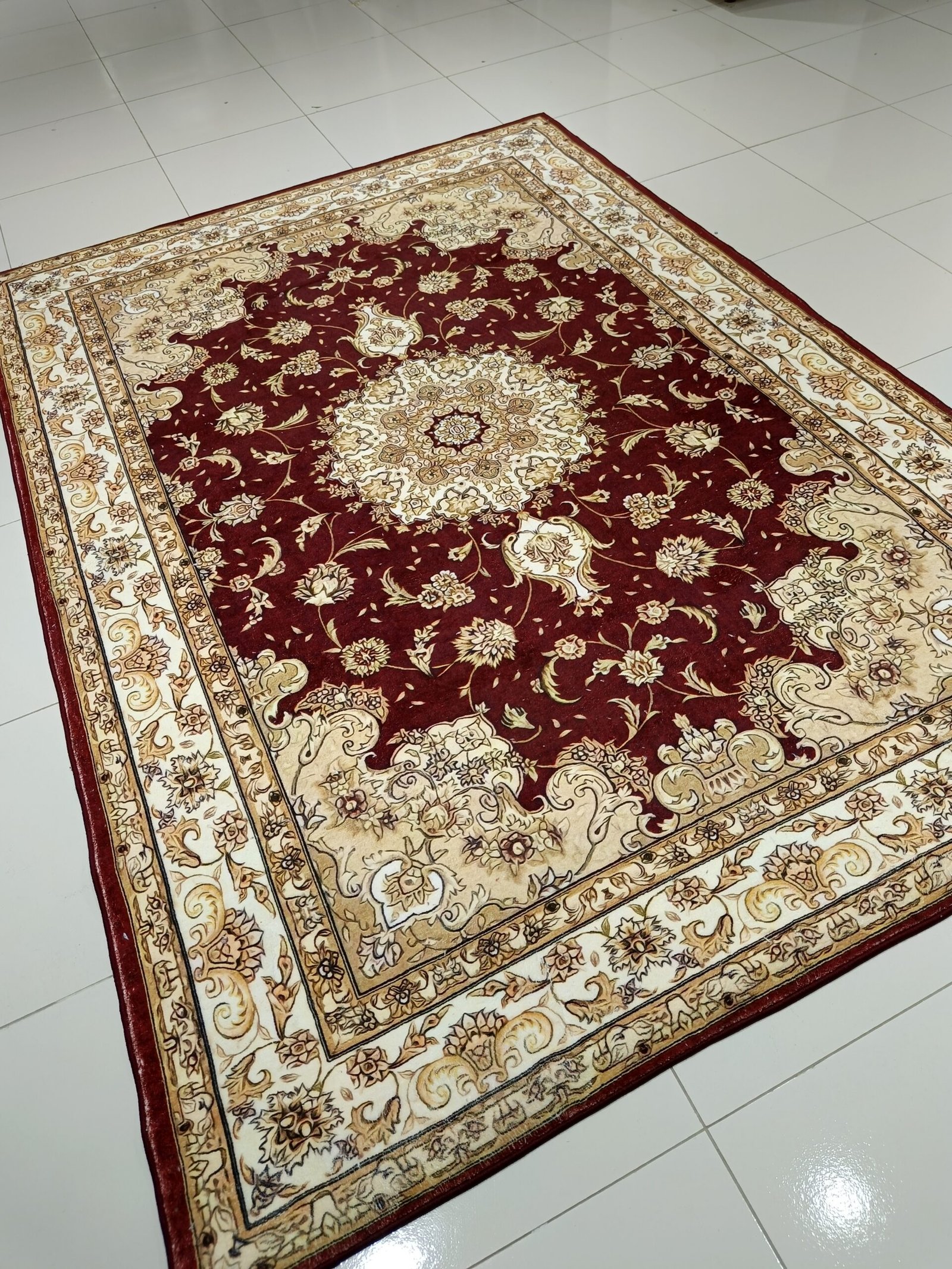 Crafted from premium soft velvet (8mm thickness), it features a deep maroon center medallion, surrounded by traditional Persian floral motifs and an ornate border in beige, cream, and gold tones.