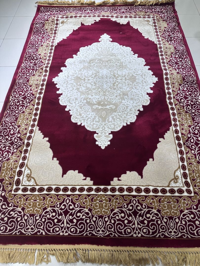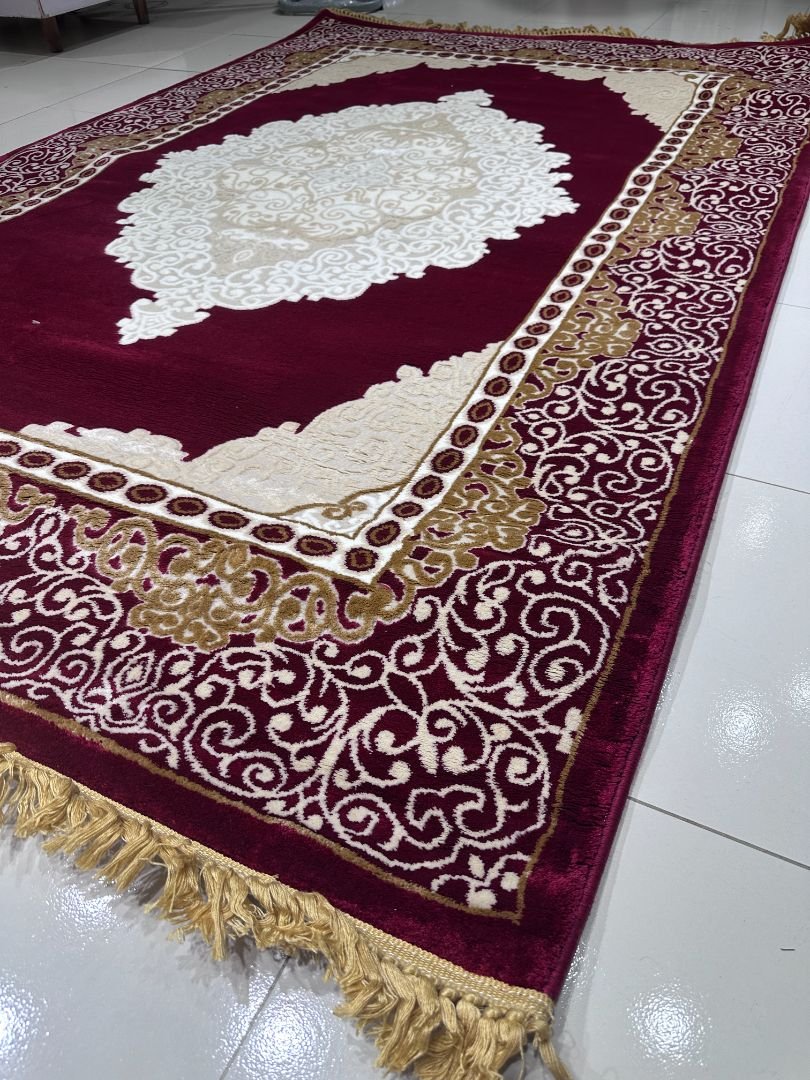 Made in Turkey using premium acrylic yarn, this carpet offers a soft, silky touch with a refined shine, giving it a premium feel underfoot. The elegant tassel finishing and intricate borders reflect traditional Turkish craftsmanship, making it perfect for both décor and prayer use.